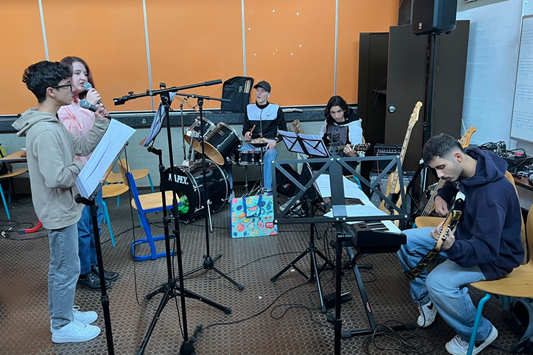 Die Schulband probt ab dem 2. Schulhalbjahr einmal wöchentlich montags während der Mittagspause.