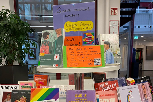 Um Verständnis zu fördern und den respektvollen Umgang miteinander zu stärken, waren wir mit unserem Projekt „Ganz normal anders“ Donnerstag in der Stadtbibliothek Siegburg. Wir haben dort einen Tisch mit Büchern zum Thema LGBTQ+ zusammengestellt. Frau Behr, eine Mitarbeiterin der Bibliothek Siegburg, hat uns zuvor in die Katalogrecherche eingeführt, sodass wir viele passende Bücher finden konnten. Der Tisch ist noch mindestens bis Ende des Jahres in der Bibliothek ausgestellt und alle sind herzlich eingeladen, die Bücher anzusehen und mehr darüber zu erfahren.