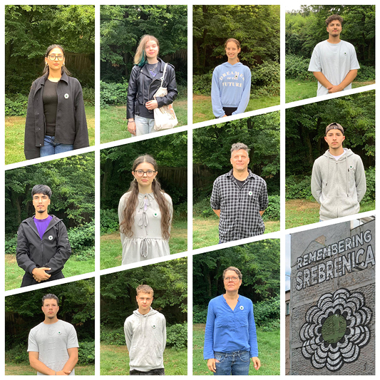 Als Schüler*innen und Lehrer*innen vom Projektkurs Bosnien-Herzegowina gedenken wir der Opfer und zeigen das symbolisch durch die „Blume von Srebrenica“. Wir haben über unsere Schulpartnerschaft Freundinnen und Freunde in Bihac im Nordwesten von Bosnien-Herzegowina gefunden, mit ihnen an einem Projekt gearbeitet, ihre Stadt kennengelernt, zusammen eine schöne Zeit verbracht. Heute möchten wir unsere Solidarität mit ihnen und ihrem Land zeigen und tun dies über das Symbol der weiß-grünen Blume, die für die Erinnerung an Srebrenica steht.