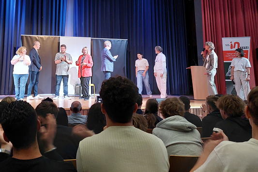 Nach den Spielszenen kamen die Jugendlichen mit den Kommunalpolitiker*innen von CDU (Petra Schonlau und Anna Diegeler-Mai), SPD (Sabine Nelles und Lukas Wagner), Bündnis 90/ Die Grünen (Peer Groß), FDP (Tristan Roggendorf), SBU (Ralph Wesse), der Linken (Nicolai Mergner und Raymund Schoen) und dem BSW (Michael Otter) ins Gespräch. Die Schüler*innen forderten beispielsweise die Öffnung der Sportplätze für alle, überdachte Treffpunkte mit Bänken für Jugendliche, bessere ÖPNV-Verbindungen in Kombination mit einem Schülerticket sowie mehr Sicherheit im öffentlichen Raum, insbesondere in Bahnhofsnähe. Diese Wünsche wurden von den Kommunalpolitiker*innen wohlwollend aufgenommen.