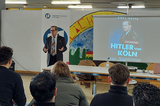Das Bild auf der Leinwand zeigt das Cover des Buches „Ich war der Hitler von Köln.“ Man sieht einen Mann im Ledermantel, Axel Reitz, der schon mit dreizehn Jahren in die Neonaziszene kam und sich ihr rund eineinhalb Jahrzehnte zugehörig fühlte. Der von den Medien als „Hitler von Köln“ Bezeichnete, fühlte sich geehrt, stellte dies doch genau das dar, was er sein wollte: ein überzeugter Gegner der Demokratie, ein Leugner des Holocaust. Seinen Lebensweg in die rechtsradikale Szene, seinen Ausstieg und seinen Kampf gegen jede Form des Extremismus führte Schüler*innen des Geschichts-Leistungskurses der Q2 und der Jahrgangsstufe Q1 eindrucksvoll vor Augen. Möglich war dieser Vortrag durch die Kooperation mit der Friedrich-Naumann-Stiftung, vor Ort vertreten durch Frau Schlösser und Frau Wolf.