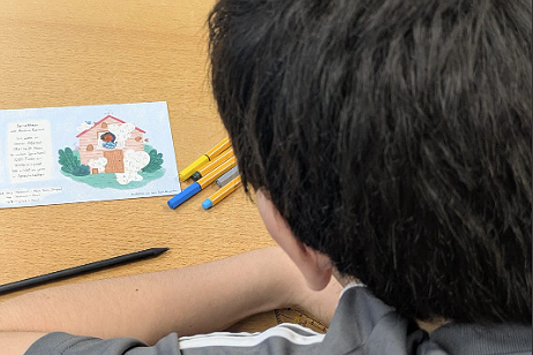 Ein besonders interessantes Element war die Einbindung verschiedener Sprachen in den Workshop. Frau Karimé ermutigte die Schüler*innen, Wörter aus anderen Sprachen, mit denen sie verbunden sind, einzubringen und in die Gedichte zu integrieren. Dieser Ansatz ermöglichte den Schüler*innen nicht nur, ihre eigenen Sprachkenntnisse zu präsentieren, sondern auch der Vielfalt der Sprachen in unserer Schule einen Raum zu geben. Alle Schüler*innen gestalteten abschließend ein kleines Faltbuch mit einer kleinen Geschichte oder einem Gedicht.